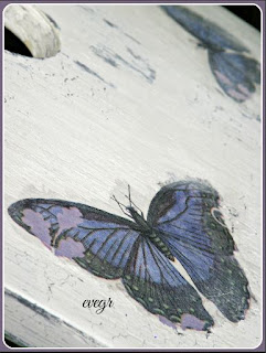 Liblikatega salvrätid olid küll algselt mõeldud kapi uste peale, aga liiga kirjuks oleks läinud ja nad poleks seal nii mõjule pääsenud kui taburetil. Salvrätitehnikat tegin sinnamaani õigesti, kuni panin märja salvaka aluspinna peale. Seda sai kinnitatud nii krakleelaki kui ka liimi abil. Kõik need protseduurid ei saanud minu puhul esimese korraga läbitud, vaid mõnda etappi tuli ka korrata. Nii ma siis kulutasin ja vanutasin ja hõõrusin mõne koha pealt suure hooga isegi natuke palju maha, aga huvitav pind jäi.